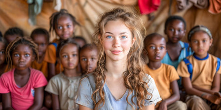 Young Volunteer Girl with Local Children in Rural Classroom Setting.