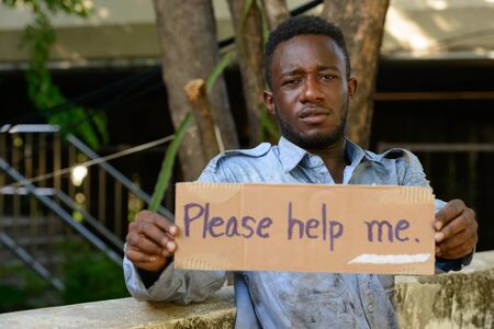 Young homeless African man looking depressed in the streets