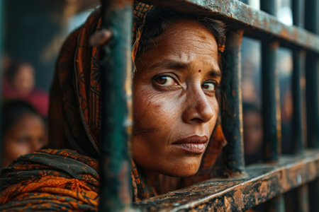 close-up of a prisoner behind bars in jail.