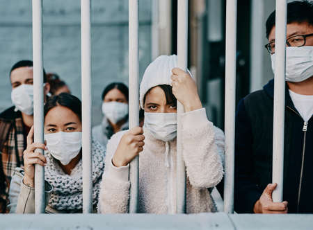 Foreign people in isolation wearing covid face mask at the border or in quarantine or airport looking unhappy, upset and angry. Poor refugees, immigrants and tourists stuck behind a gate in lockdown