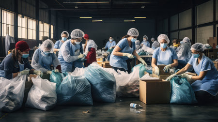 Dedicated volunteers pack essentials for medical aid, emphasizing support. Showcases global humanitarian effort within warehouse promoting generosity.