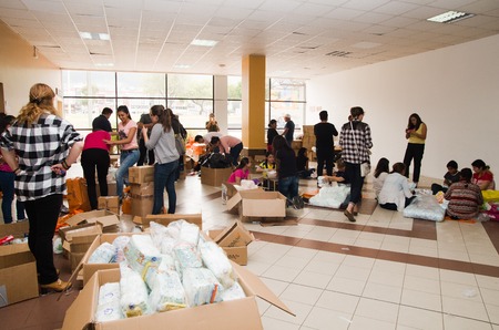 Quito, Ecuador - April 23, 2016: Unidentified Volunteers of Quito providing disaster relief for earthquake survivors in the coast. Gathered at Bicentenario Park.