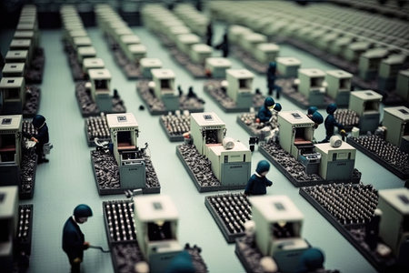 robotic assembly line, with a stream of parts moving past and being assembled into finished products, created with generative ai