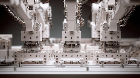 Close-up view of advanced robotic arms in an industrial automation environment focused on precision manufacturing and efficient assembly processes.