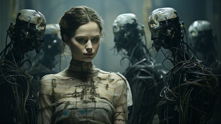 Woman engaged in observing humanoid robots at a futuristic exhibition, highlighting advancements in technology and the exploration of human-robot interaction