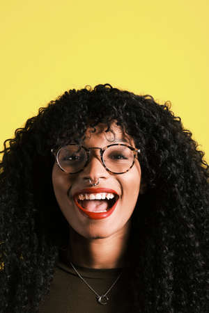 young african american with afro hairstyle, eyeglasses and yellow background