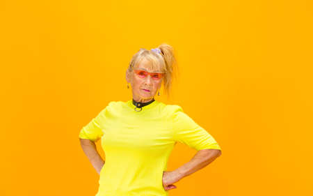 Sunny. Senior woman in ultra trendy attire isolated on bright orange background. Looks stylish and fashionable, forever young. Caucasian model in sunglasses, bright attire and sneakers. Flyer