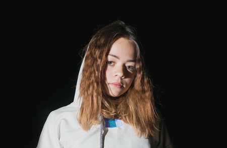 A young girl in a light sweater poses in the dark