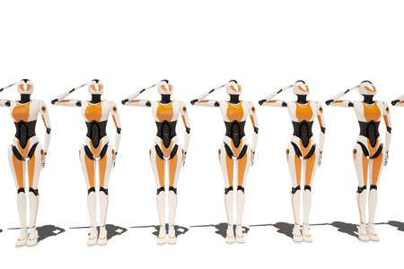 Female cyborg army concept with 3d rendering group of female cyborgs or robots in a row