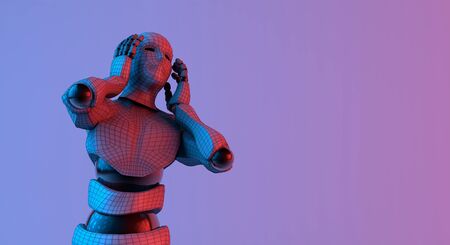 Robot wireframe heard sound on gradient red violet background, 3d rendering