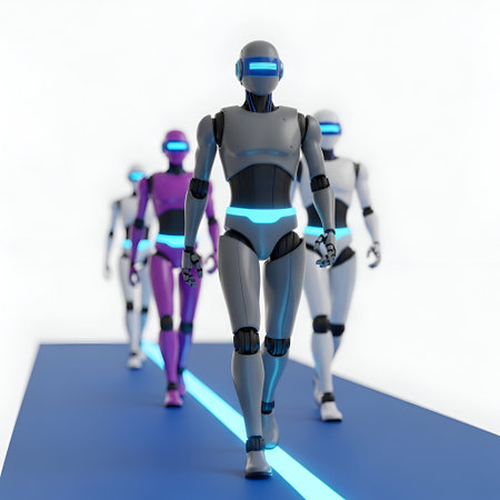 Four humanoid robots with sleek, metallic bodies are walking in a straight line on a blue surface. The robots glowing blue accents on their bodies and faces, with one robot in purple, two in white, and one in silver. The scene is set against a plain white background, emphasizing the futuristic and high-tech appearance of the robots. The robots appear to be in motion, suggesting a coordinated or synchronized movement.