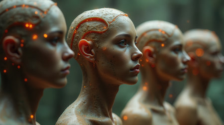 Inter connected human beings or androids. Concept of artificial intelligence or collective intelligence. Created with Generative AI technology.