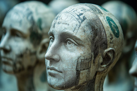 A group of statues with different facial expressions are shown, AI