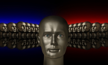 Silver mannequin head flanked by two groups of heads lined up opposite one another on a reflective black surface with red and blue background