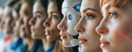 group of robots in female image standing in rows artificial intelligence and robotics concept