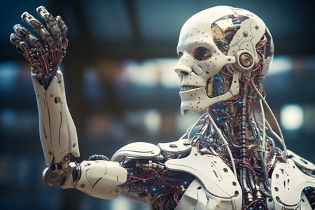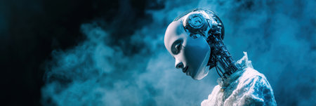 This image presents a detailed view of a humanoid robot head and upper body. The subject features a metallic structure, with visible mechanical components. Cool colors and focused lighting illuminate the scene. It could be suitable for technology articles, science fiction projects, or concepts about artificial intelligence and future innovations.