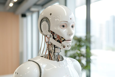 Futuristic humanoid robot with intricate mechanical components and sleek design, showcasing advancements in artificial intelligence and technology in modern environments