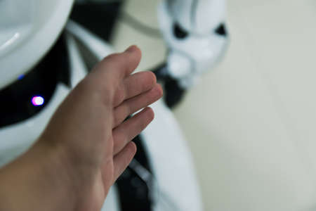 White cyborg hand about to touch human hand on dark background 3D rendering