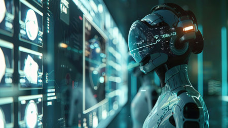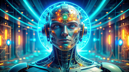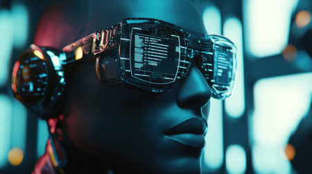 Futuristic robotic mannequin with high tech glasses, neon colors, and digital interface, representing technology, innovation, and cyber aesthetics