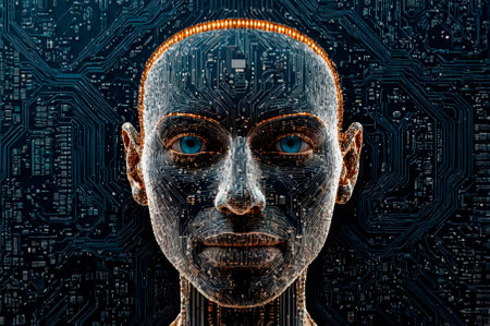 Artificial Intelligence Conscience - Existential Threat from AGI - AI Takeover Concept with Digital Face on Tech Background. Generative AI technology