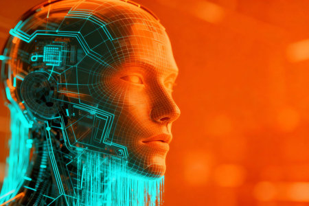 digital data deep learning ai robot bionic automatic face, technology network, cyberpunk futuristic concept, plexus cell brain, humanoid science