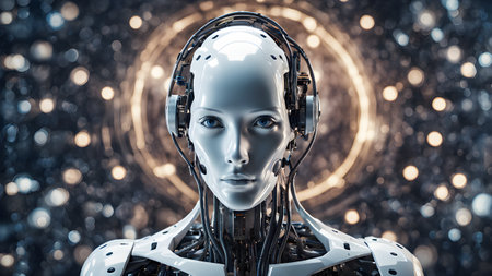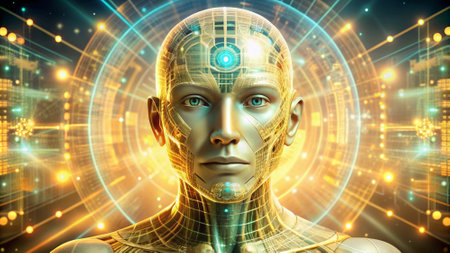 Humanoid figure features detailed circuitry and flowing golden hair, embodying a fusion of technology and artistry, creating a striking visual narrative of innovation
