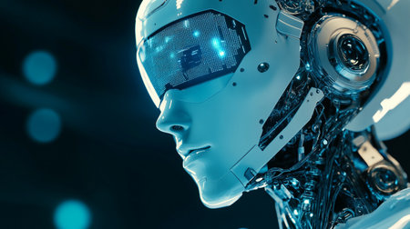 Detailed photo capturing the advanced technology of a humanoid robot with glowing eyes and intricate circuitry