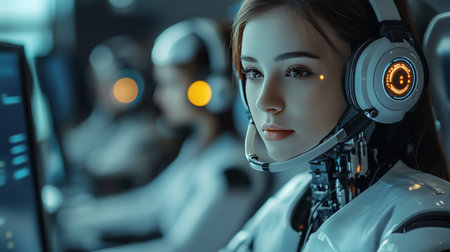 Futuristic AI Customer Service Agent Working in Busy Call Center,Focused and Ready for Next Call