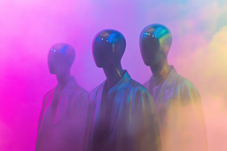 Glossy mannequins clad in trendy outfits are prominently featured against a vibrant, surreal fog, creating a captivating and dreamlike atmosphere.