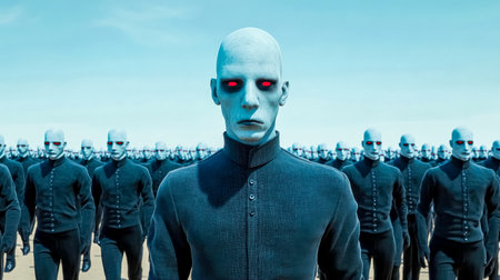 Countless alien humanoids with glowing red eyes and pale blue skin stand in a vast, uniform formation, evoking a sense of conformity, power, and potential threat