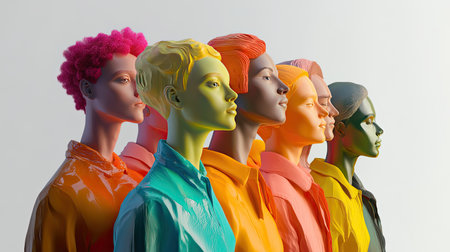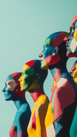 Vibrant faceless avatars stand in a row against a colorful backdrop, providing perfect copy space for creative mock ups and text placement.