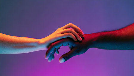 two human hands trying to touch each other on purple background in neon light concept of human relation community togetherness symbolism culture and history