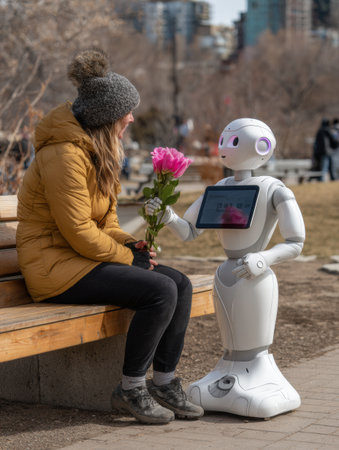 A friendly robot offers pink flowers to a woman sitting on a bench in a lively park, showcasing human-robot interaction.