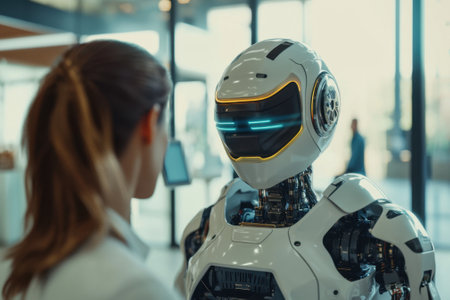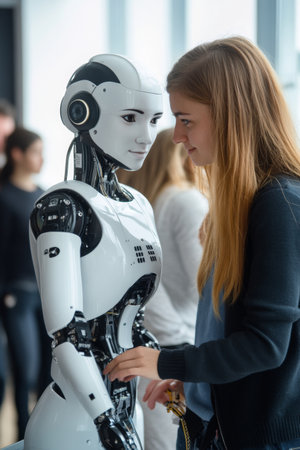 A young woman engages with a humanoid robot at a technology exhibition, showing the blend of human interaction and advanced robotics in a bright, contemporary setting.