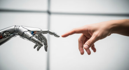 A striking image of a human hand reaching towards a metallic robotic hand, symbolizing the intersection of humanity and technology, and evoking thoughts of future collaboration.