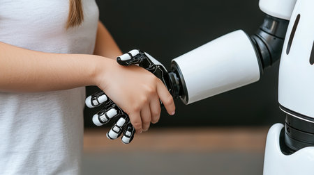 The image features a human hand and a black robotic arm clasping each other. The background is slightly blurred, showing soft colors. The atmosphere feels optimistic and futuristic.