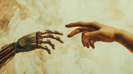 A robot hand and a human hand reaching towards each other, symbolizing the connection between technology and humanity, with a futuristic feel.