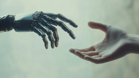 A metallic robotic hand extends towards a human hand, symbolizing unity and cooperation between technology and humanity.