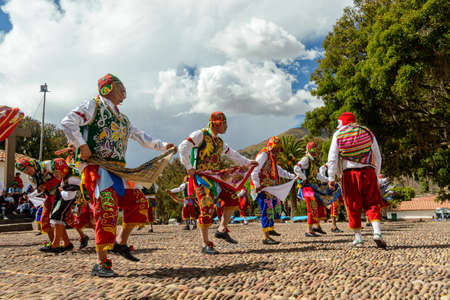 Peruvian folkloric dance, with colorful costumes in front of The Church of San Pedro Apostle of Andahuaylillas, Quispicanchi, near Cusco, Peru on October 7, 2014.