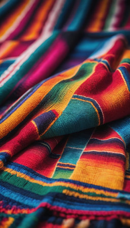 Vibrant mexican serape textiles displayed outdoors during sunset. That the image is generated using AI.