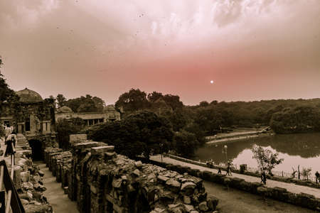 Sunset view of the landmark Hauz Khas Complex, a medieval village complex with lake that is now a tourist attraction in Delhi.