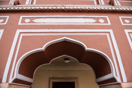 The ancient temple complex of Qutub Minar. details. The facade is made of red sandstone and white marble decorated with carved ornaments. The arched windows