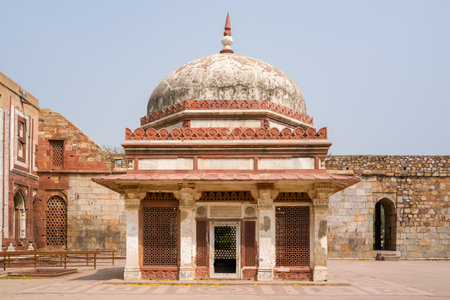 Scenic view of Sher Mandal at Purana Qila on blue sky background in Delhi, India. Red sandstone octagonal tower was used as Humayun's private observatory and library in the Old Fort.