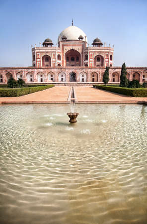 Tomb of Humayun with fountain in front at blue sky background in Delhi, India
