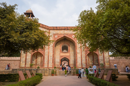 Delhi, India - November 9, 2018: Tourists visiting famous Isa Khan Tomb it is Complex in the Nizamuddin area of Delhi was built in 16th century for Isa Khan Niyazi, a noble in the court of two rulers of the Suri dynasty.