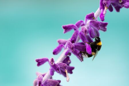 Close-up of bumblebee on lavender flowers in blossom against turquoise background. Soft focus