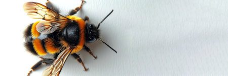 Close-up shot of a bumblebee isolated on white background. High-definition insect on a white backdrop. Concept of entomology, macro detail, and educational imagery. Banner. Copy space