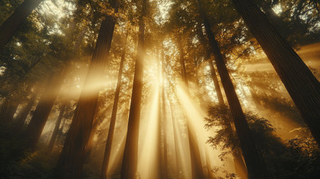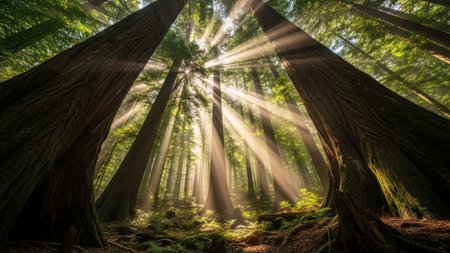 Beautiful redwood forest with sun rays coming through the trees.