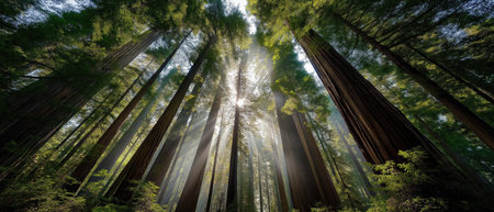 wide-angle view of towering redwood trees, created with generative ai