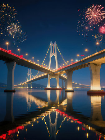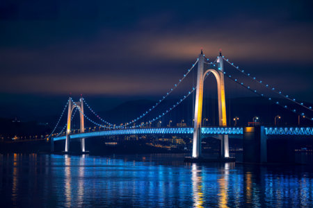 A long suspension bridge, lit with multicolored lights, stretches across a wide expanse of water. The night scene includes city lights in the background. The composition features a strong perspective and is suitable for various commercial uses, including website design, advertising, and editorial content.